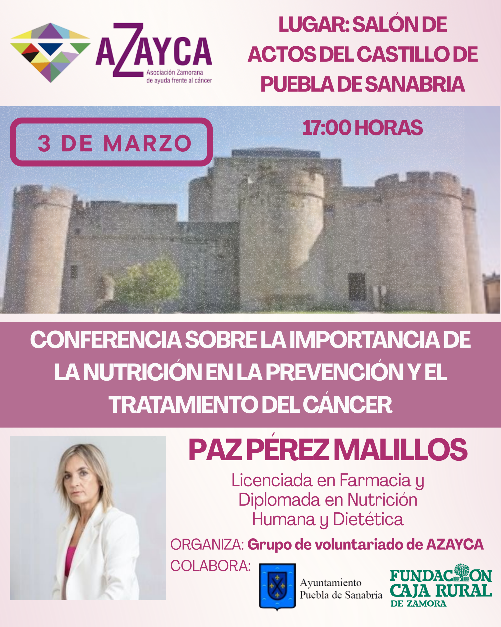 Conferencia sobre la importancia de la nutrición en la prevención y el tratamiento del cáncer impartida por Paz Pérez Malillos en Puebla de Sanabria. Muchas